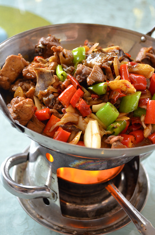 【锅仔香焖鸡】是上来的第一道,小炉子点着火,青红椒作伴,颜色很漂亮,但鸡肉肉质显老,一般。