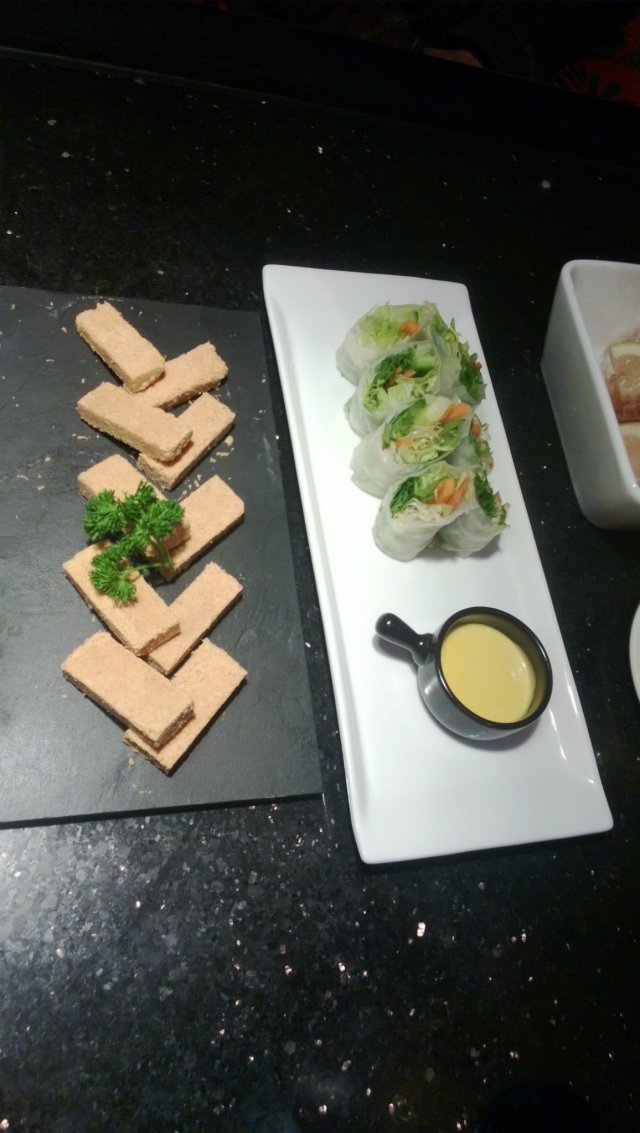 米皮沙拉卷,装盘比较漂亮,食材都很常见,米皮晶莹透明,蘸汁很特别,感觉是沙拉酱和芥末调的,口感还不错,比较推荐
