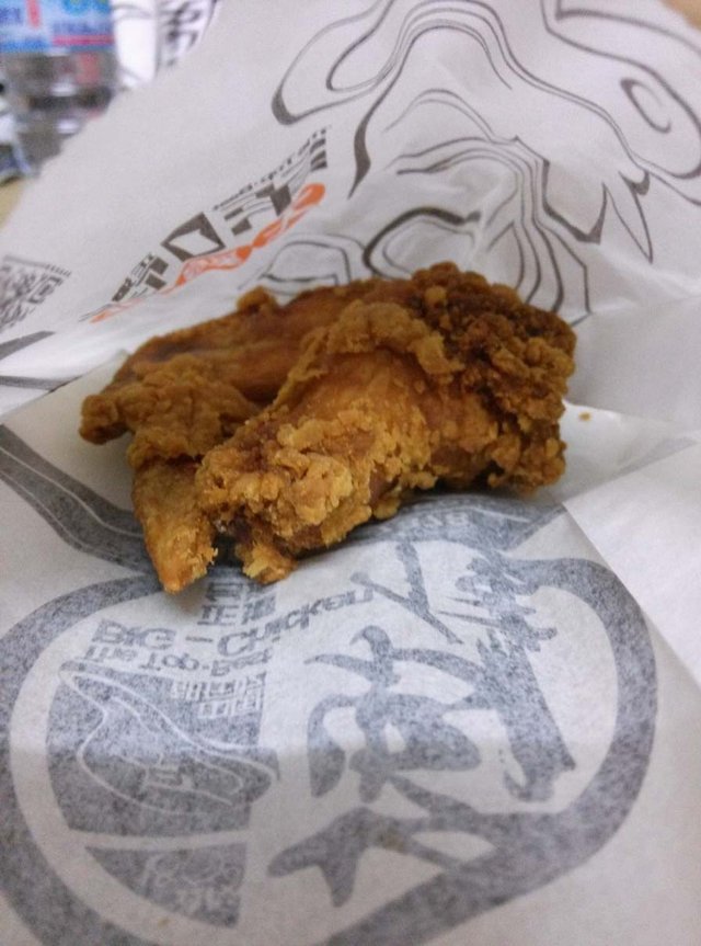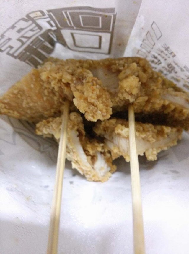 招牌大鸡排,这个单买的话是13块钱,也没有多大,不过我一个人是吃不完啦,因为一个吧,上面裹得面粉有点多,再加上一般来说油炸的东西多少都有点腻的,选的是孜然味儿,不过感觉味道有点淡,看不出来孜然在哪里,刚拿到的时候,闻着却是很香,尤其对于饥肠辘辘的人来说,诱惑太大了!老板帮我把鸡排给切了,然后还给了两个竹签