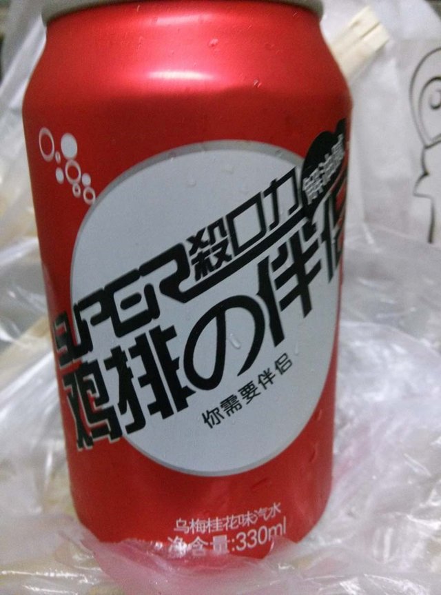 因为看《来自星星的你》一直就认为炸鸡就应该配啤酒,一直都认为那个鸡排伴侣是啤酒来着,结果没想到是碳酸饮料,不过,倒是没有喝过这种口味的,乌梅味儿的,喝过吗?如果不看标示,真的就不知道这就是乌梅味儿,有点龟苓膏的那种中药味儿……老板给我拿的时候还是冰镇的呢