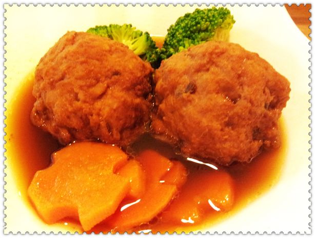 狮子头饭,16元~ 一碗白米饭配2个狮子头,还搭配了绿菜花和胡萝卜,不错~ 狮子头很软嫩,浓浓的肉香~
