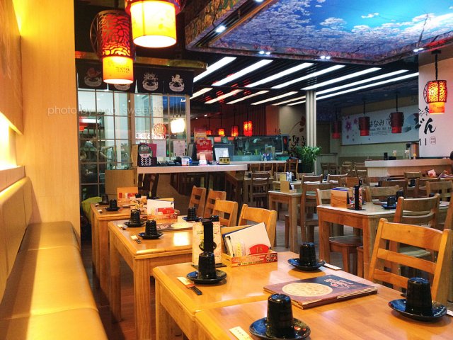 因为公司距离它家比较近,下班赶过来,也花不到多少时间,而且这家店开在中心区,交通比较方便。我到店里时大概6:30左右,只有那么两三台顾客,我心里暗喜,好多位置可以选择,当然要坐卡座。我好喜欢这家日本料理店中央的蓝色樱花灯,好好看,非常有和风的感觉。