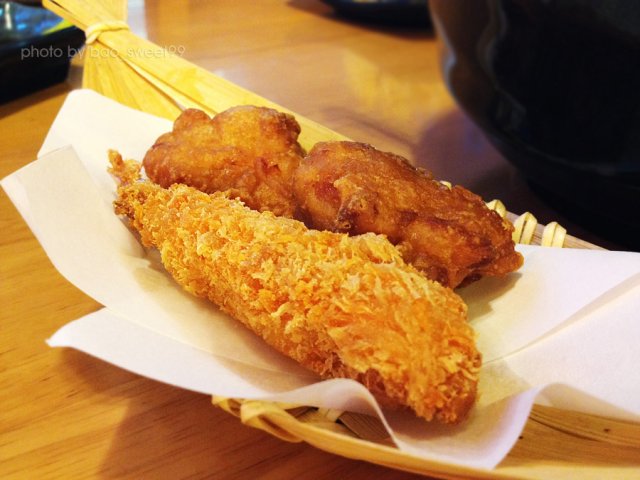 还配送了炸虾和炸鸡肉。说真的,吃了这炸虾和炸鸡肉后,我对它家别的油炸类食品,一点都不感兴趣了,因为炸粉好厚,可想而知,别的油炸类粉也肯定很厚。