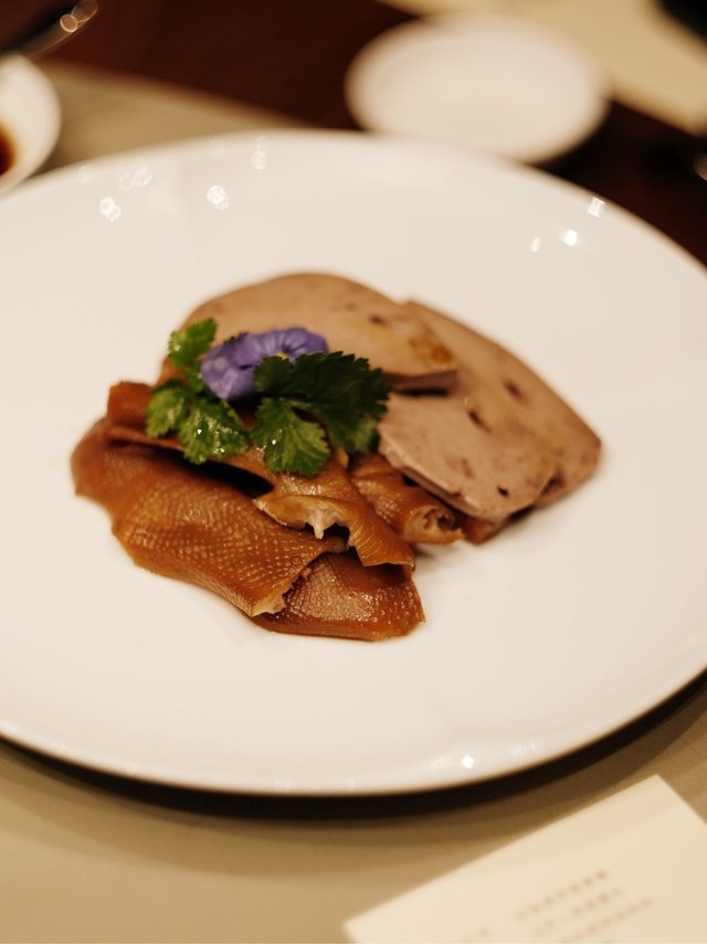 脱骨老鹅掌配粉肝是一场巧思的极致展现。鹅掌筋骨之间的韧性与粉肝绵密细腻的质感,仿佛是一场硬与柔的角力,却在交错间寻得了和谐,最终落于平衡之境。捞汁花螺则像是一笔海味的轻描淡写——鲜活的花螺肉小巧灵动,游走在酸甜捞汁的怀抱里,如同水墨在宣纸上洇开的点染,一抹鲜味随之若隐若现,转瞬即逝却余韵悠长。