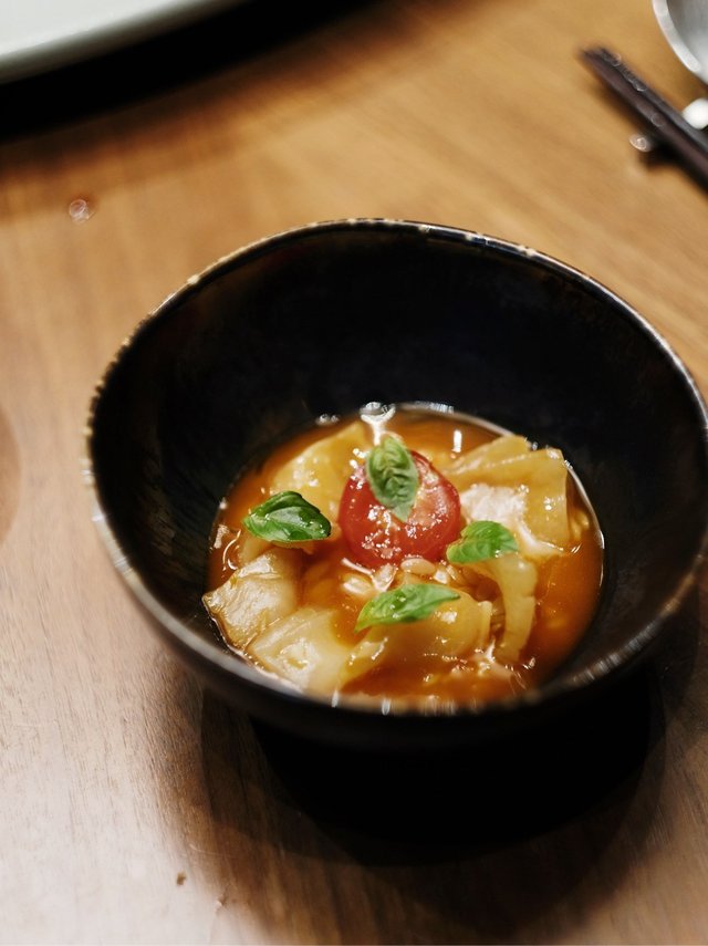 随后的发酵番茄扣甄选花胶,是这场四手宴的点睛之作。花胶的丰盈胶质,在发酵番茄的酸爽牵引下,如经时光淬炼般生出微妙的层次感,酸与滑反复在舌尖交错缠绕。番茄虽非潮汕传统食材,却在这里焕发出新的生命力,宛如旧曲谱上奏出的新旋律。它与花胶的粘稠共舞,不仅是味觉的对决,更是当代与传统的一场绝妙对话——每一口,都是时间与风味碰撞后留下的悠然回响。