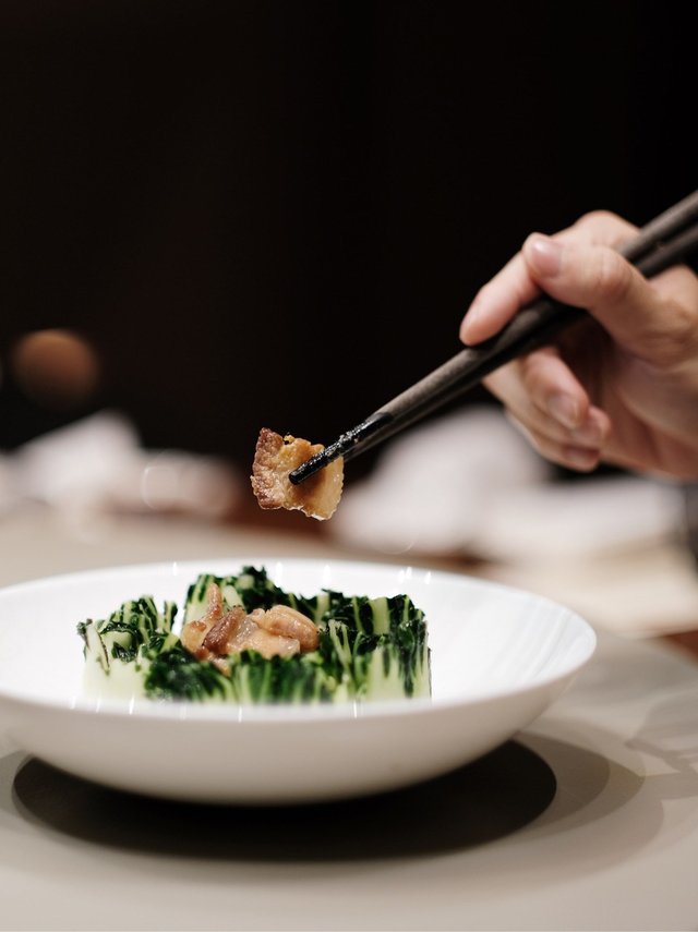 沙茶咖喱浸染的小青龙,是潮汕与东南亚风味的交响。一勺沙茶酱厚重如深秋的暮色,将海的醇美托出,层叠的咖喱香辛恰如其分地点燃味蕾,一道小青龙便如行经热带雨林,层次起伏间尽是丰盈而温暖的风土气息。斗白苗入锅,须凭猪油渣与豆酱合力,方能展现这道菜的深情——猪油渣的脆爽是炊烟袅袅的回忆,豆酱的浓郁则是时间沉淀的馈赠,两者在炽热的锅气中相遇,仿佛乡野深处的田园清梦。
