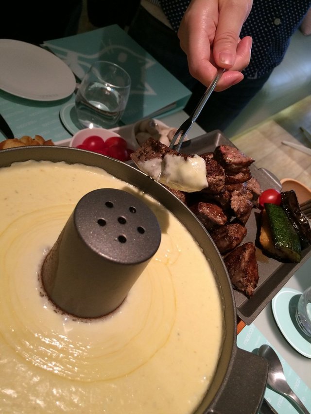 重量级的来了【米子特制芝士锅】配菜有蕃茄,蘑菇,蒜香面包片。最好吃的莫过于半生熟的小牛肉啊啊啊啊,放在芝士锅里刷一刷。真心好嫩的口感,好吃死勒。香喷喷。根本停不小来。一份288的价格也是可以接受的,芝士好厚的。吃完不浪费,芝士底一样吃掉,要知道在国外,这种芝士锅底都有餐厅专门回收的。精华都在底部
