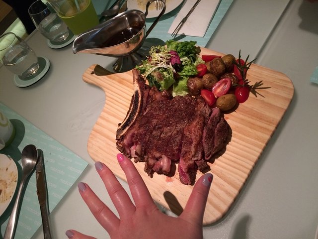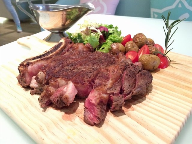 【800G带骨肉眼牛排】牛排份量十足,比爱疯6还大。肉质丰腴。配上秘制的烧肉酱。好吃。好有嚼劲的,牛排品质的确不错。配菜的小土豆嚒,想说土豆放在那个芝士锅里一刷。都好美味的