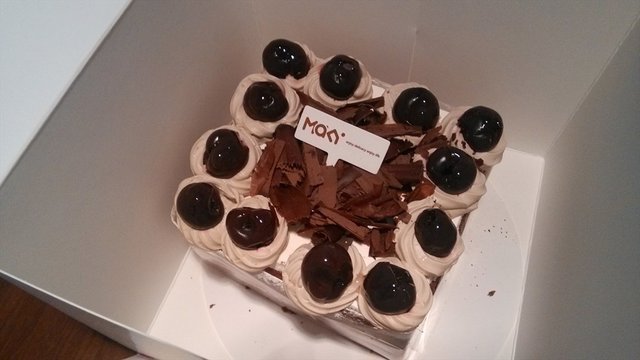 还有一款是巧克力的,蛋糕是巧克力色,也是一层层的,上面是褐色奶油做得装饰,放的车厘子之类的,中间是黑巧克力碎,还有一个米琪牌子,用大块的巧克力做的。