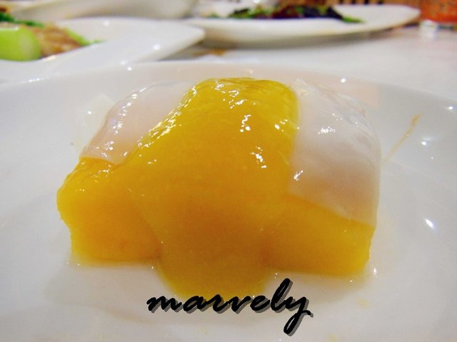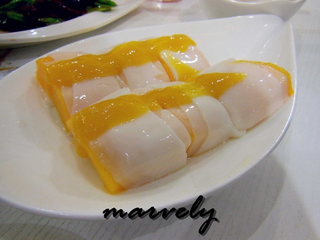 这道芒果肠粉,还是挺有意思的,薄薄的白嫩的肠粉皮包裹着一整块的芒果果肉,上面还浇着芒果酱,看起来就让人食指大动,但是芒果不够甜。