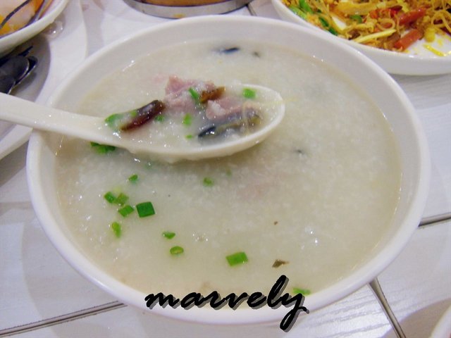 粥里的皮蛋和瘦肉挺多的,两者混合起来,使得粥底有着一种淡淡的清香气味。