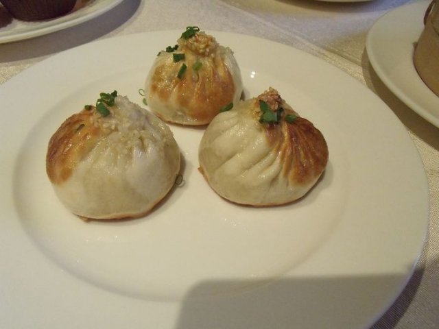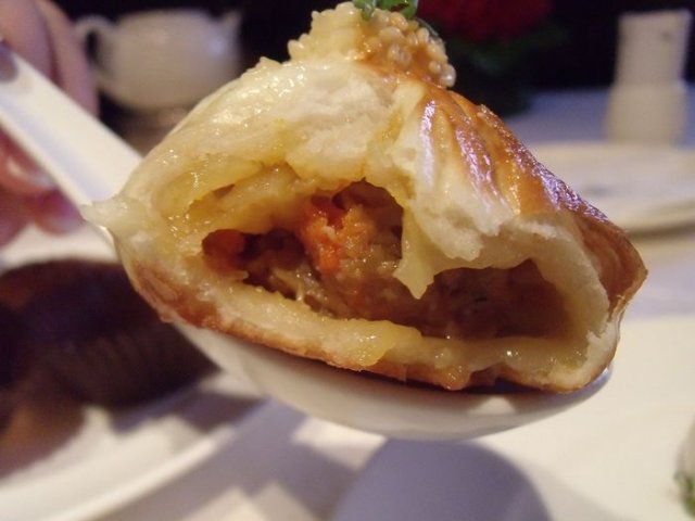 生煎蟹粉包:大家要说了,这个不是上海特有小吃嘛,怎么也变粤菜了,问了一下主厨,说是改良版的生煎,让我尝了便知。一口咬下,满口的鲜甜,这是上海传统的生煎所没有的,仔细一看里面满满的蟹黄啊,用料十足,有图为证。原来广东人喜欢吃海鲜所以厨师加入了蟹黄作为辅料。同时下面的底子也是煎的香酥松脆,但是不油腻,大赞之。