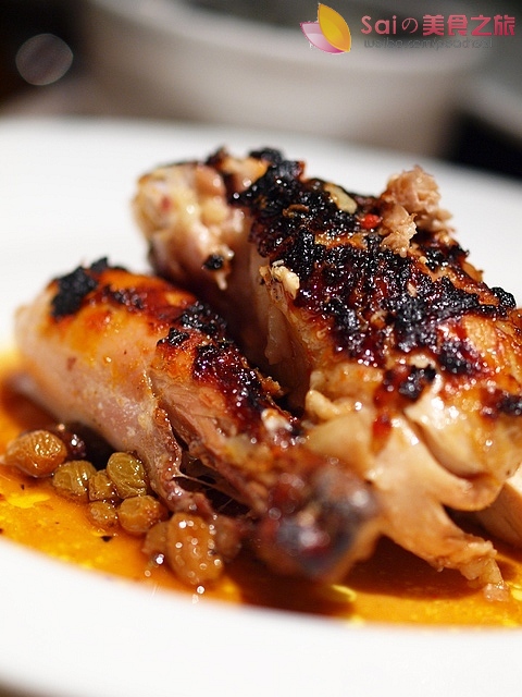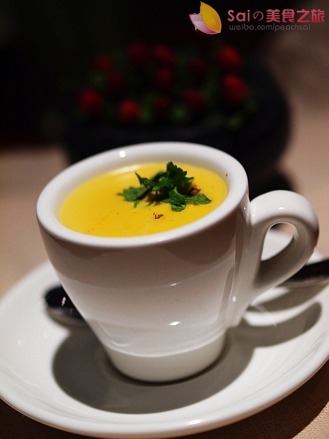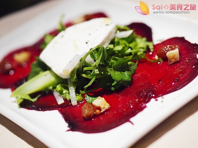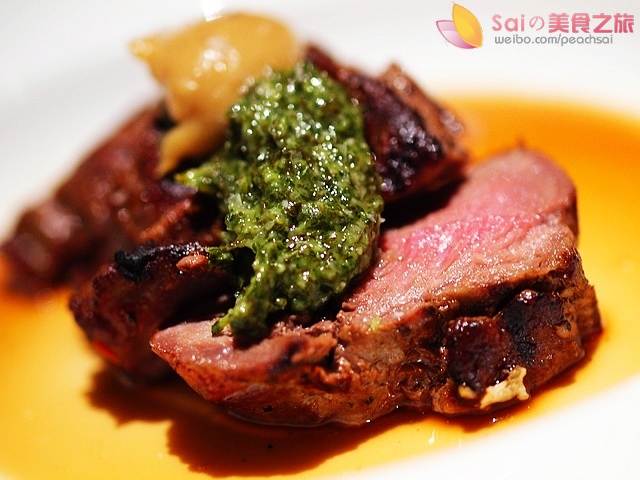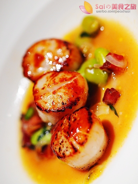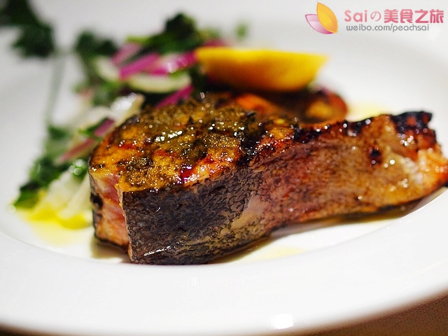 前菜有碳扒新鲜扇贝,扇贝2面煎过很香,配上蚕豆和培根卷上sauce一起吃才好;脆皮烤乳鸽跟广式的不同,配了葡萄干、香菜和腌茄子,不加酱稍显淡却透着烤出来才有的香;烤红菜头薄切,温热蜂蜜+feta74还有芝麻菜,滋味很曼妙;玉米汤小杯盛放,搅拌一下底部带带有点小辣~面包+黄油,超好吃!!