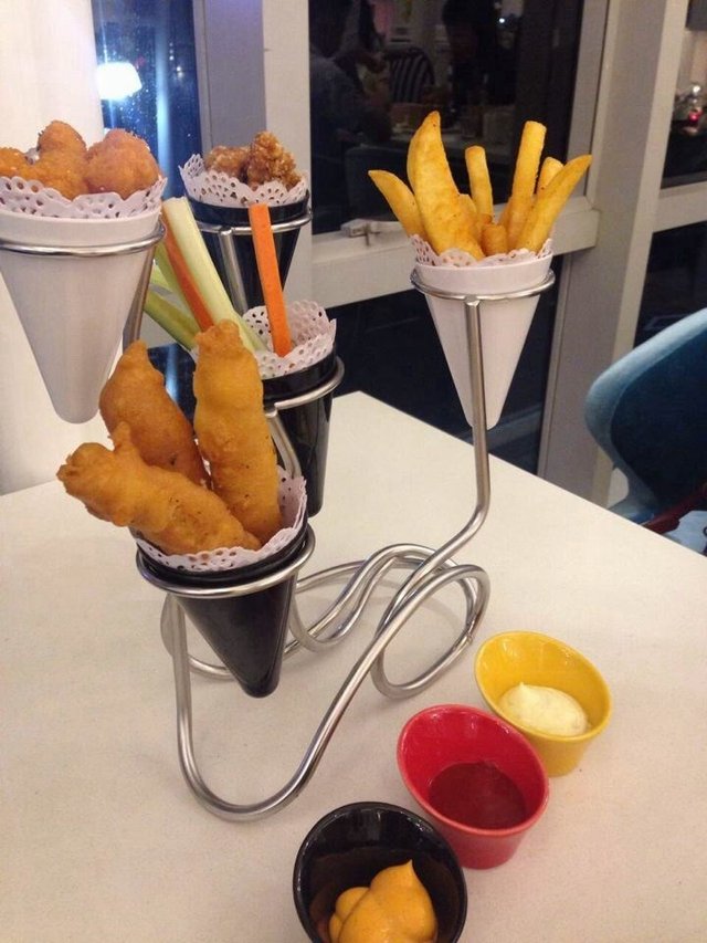 花园点心里面是几样小煎炸食品,像是薯条鳕鱼条鸡米花这些,不过造型还是比较有特点的,味道其实一般,比如薯条炸得有点过了,吃起来太硬,有几根简直是薯棒啊,囧。其他的鳕鱼条和鸡米花倒是挺好的,外脆内软,沾上调料后吃起来挺不错。中间的黄瓜条和胡萝卜条是生的,味道就是那个味,没什么可说,摆造型。