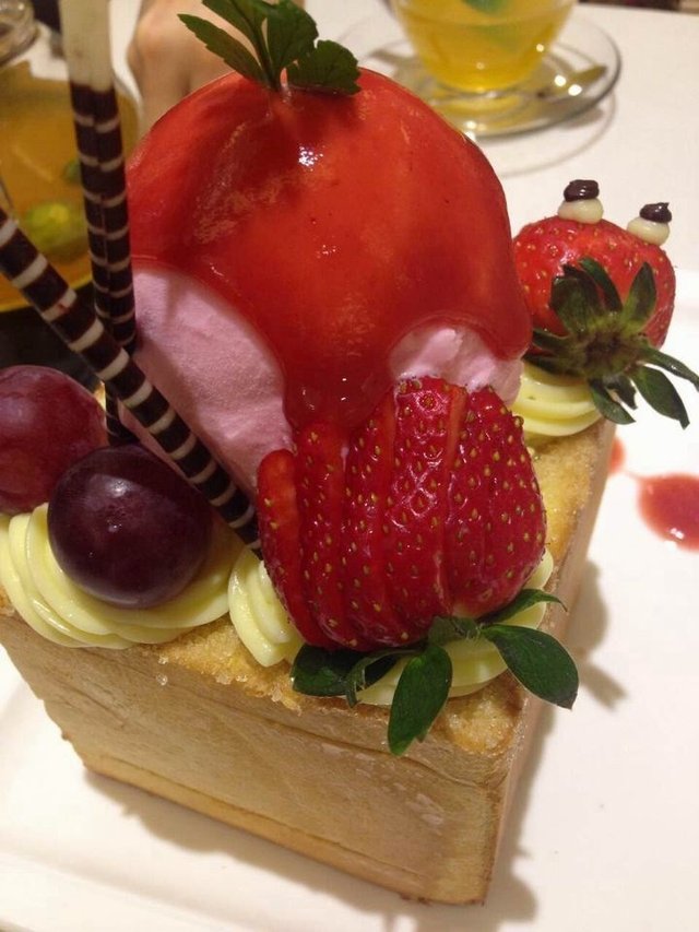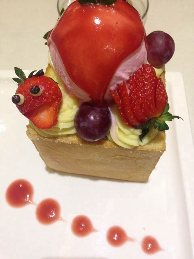 爱恋草莓样子很可爱,草莓雕成个顽皮的小猴子吐着舌头,呵呵,吐司味道很不错,里面面包切块烤得焦香脆,上面的草莓冰激凌很酸甜,下面的奶油球味道也是很甜,像是卡仕达酱蛋奶味,吃多了会有点腻。草莓比较新鲜,和奶油冰激凌一起吃后味道是酸的,甜味都不突出啦。提子味道很不错,甜得很而且果汁足。