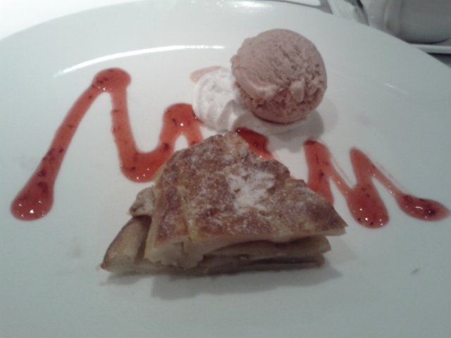 主菜:牛排要7分但至少有8分,略坑爹;推荐煎比目鱼配白酒黄油汁,做的非常入味,鱼肉也很细腻,好吃