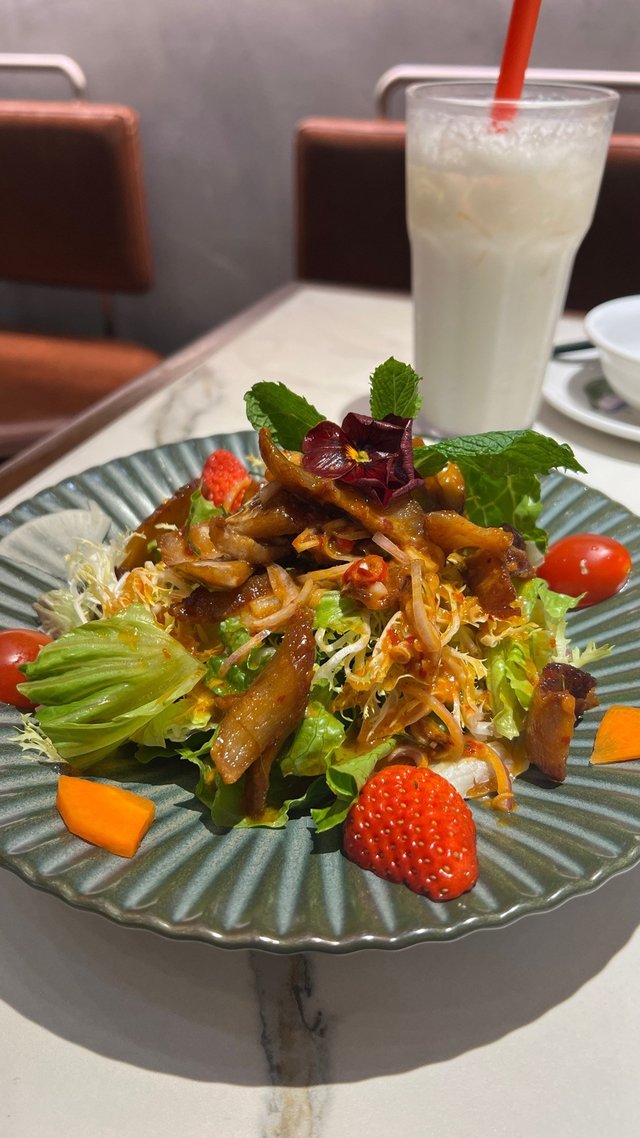 豬頸肉沙律,個豬頸肉整得外皮好脆,但入邊好淋,火候燒得啱啱好,而佢個沙律加咗啲泰式嘅醬汁,辣得來好過癮,同埋好開胃,酸辣得來停唔到口。
