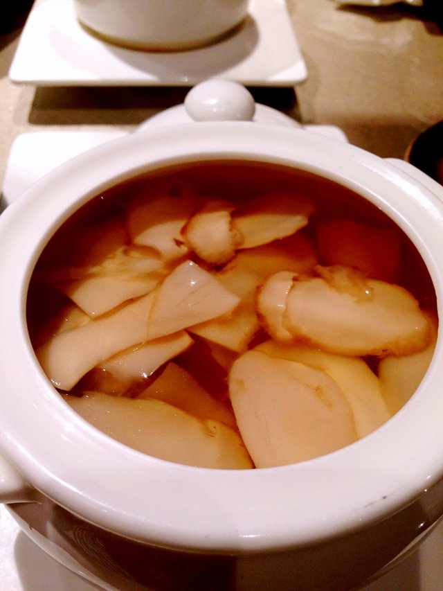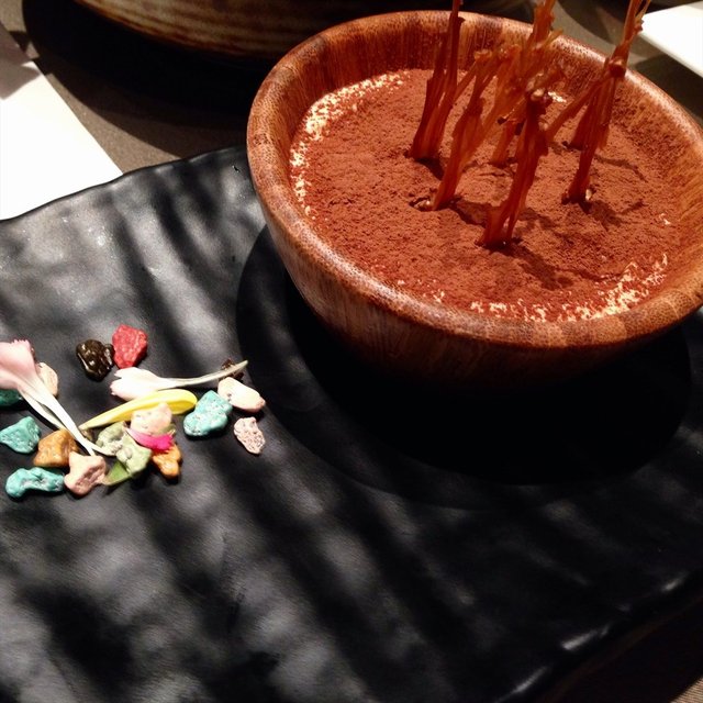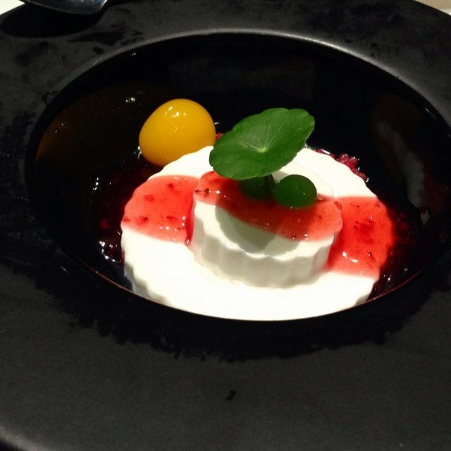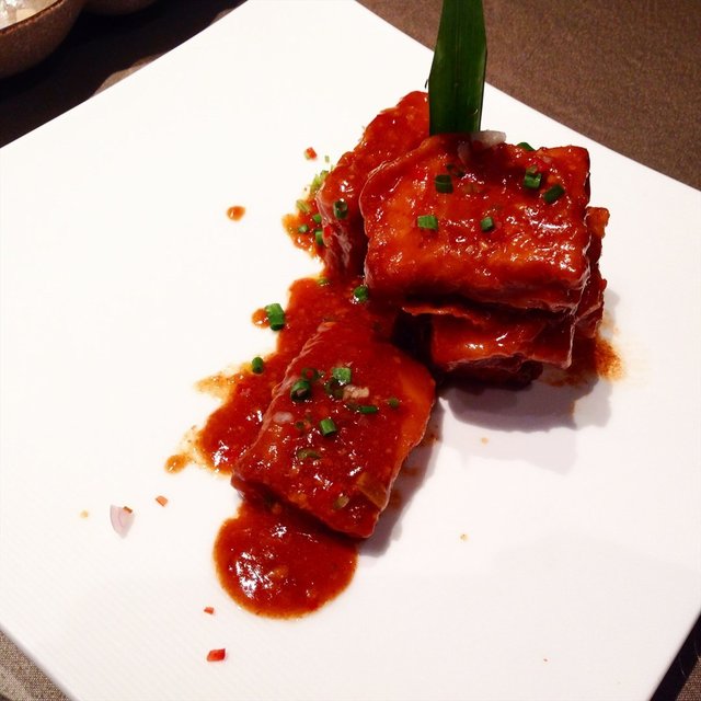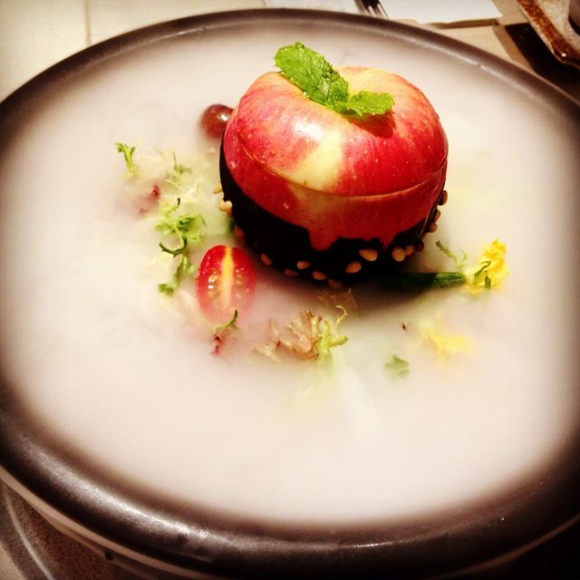 后来miruku写推送的时候是这样说的:“上桌后会配有一杯玫瑰酒,服务员点燃玫瑰酒直接浇在牛肉旁边的石头上,高温持续在石头上面燃烧,不久你就会闻到一股玫瑰酒特有的清香,酒香伴随石头遇到高温后散发出来的矿物质原味,渐渐流到牛肉下面,切一小块儿蘸上旁边的海盐放进嘴里,玫瑰酒略带苦涩伴着海盐的清新,肉质简直嫩得要飞起了!完全是三层熟的口感啊!不过你真以为它三层熟那就错了,其实它是全熟!之所以全熟都能保持这么鲜嫩的肉质是因为这道菜特别使用巧妙的低温烹饪手法,看来也是一门学问了~”