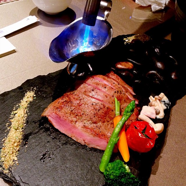 除了用分子技术做出来的甜品,印象最深的就是火焰澳洲雪花牛了。