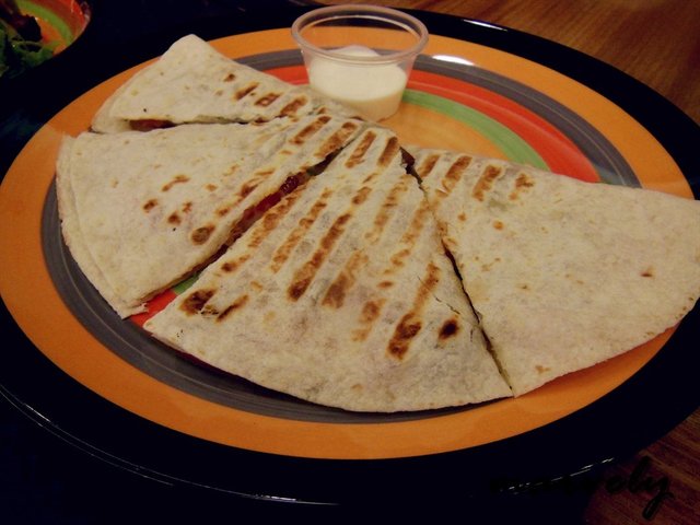 当地人貌似把这种饼叫做凯萨蒂饼,店里按照面饼的大小分为标准和大号两种,标准的是10寸的,再大一点的是12寸的。饼的做法也很简单,再已经备好的皮子上的半边,放上相应的配料,再把另外一边翻过来就可以了。而各种配料都是已经配好放在各个容器里,感觉更加快餐了。这道鸡肉芝士饼,其实就是把鸡肉丝加上番茄粒混合在一起,除此之外并没有太多的作料了,而搭配的酱料,是酸奶油,它的口感,不厚重,也不特别酸涩,绝对对这个饼的味道增添不了多大的口感。