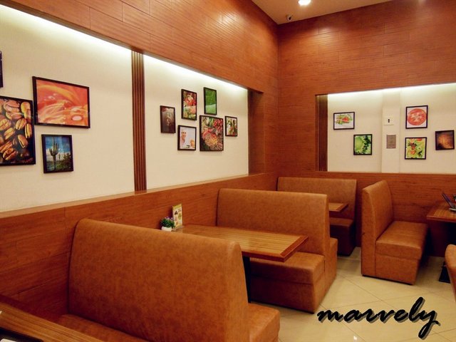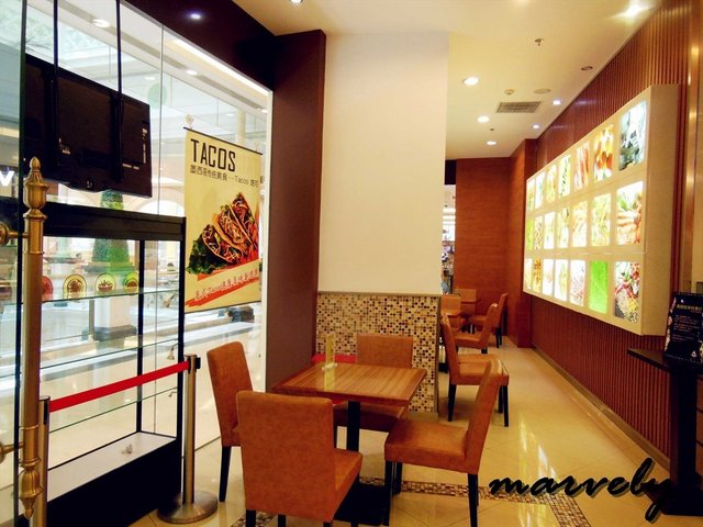赛露芭的店铺,快餐店的特征很明显,进门就是前台,前面点单,后面结账,食物店员会帮忙端到你的桌子上。桌椅的样子和色调都是统一的,和店里墙壁上使用的装饰木板一样,都是深褐色的,不过店堂空间比较宽敞,所以这主题颜色,虽然肯定不跳跃,但也不压抑,倒是让我想起了很多公路片里,车子一路从美国开进墨西哥,公路两旁都是这种颜色的沙漠。