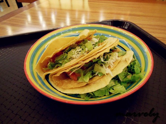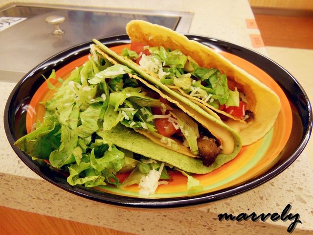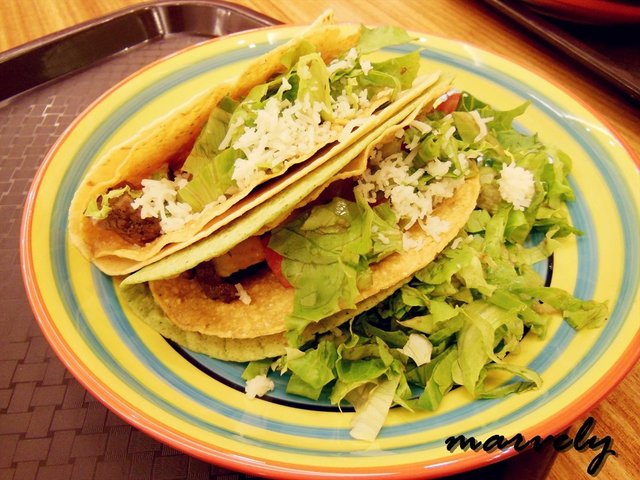 塔可,其实才是正宗的墨西哥卷,也叫做墨西哥玉米饼。在玉米粉做成的饼里,夹着各种配料,吃起来的感觉是外面脆脆的,里面则融合着各种口味,颜色也丰富。我一口气点了三种塔可,分别是香烤牛排粒塔可、墨式烩猪肉塔可和香烤鸡排丁塔可。同样是折成扇形的饼皮里,最下层放的都是肉,然后依次加入了番茄粒和生菜丝。烤过的牛排粒,口感上厚实了很多,但是味道依旧很淡,而且过多的番茄粒和生菜丝,很容易就覆盖和减轻了肉质的味道。
