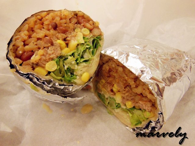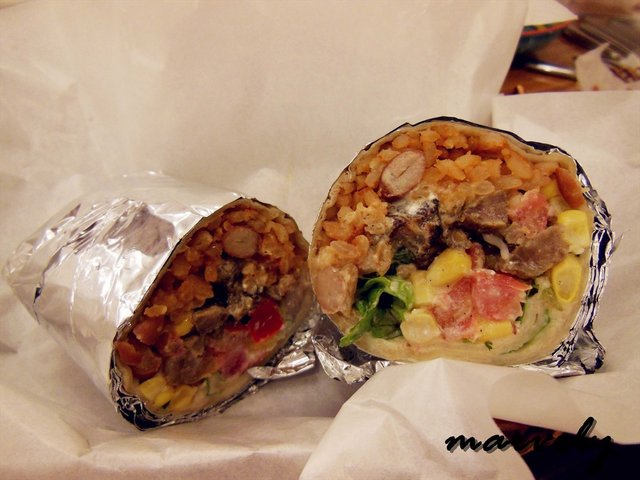 KFC的鸡肉卷里,不是鸡肉就是蔬菜,赛露芭的百味卷里,还有米饭。用来包裹的卷皮,就是之前芝士卷用的皮子,在加入猪肉、番茄粒、生菜丝这三种雷打不动的主菜之外,还可以在两种墨西哥特色酱料之间进行选择,原谅我记不住哪些看似简单却很容易会遗忘的酱料的名字,总之我最后选择酱料里面有玉米粒。不过无论这酱料如何,它的加入只是使得卷饼和配料以及米饭之间可以更加融合,味道,却还是偏清淡的,以至于我咬了一口,就没兴致再吃下去了。