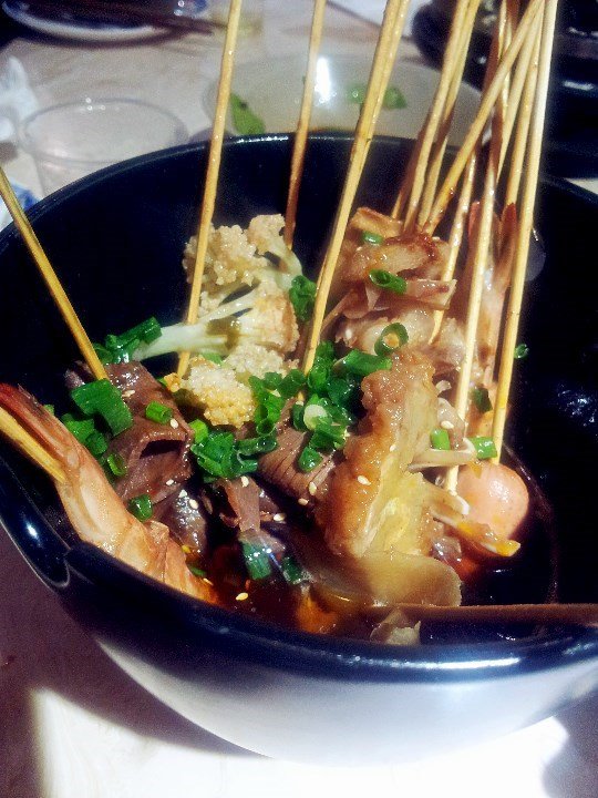 成都串串:看菜单时候,最先看中的菜,一直长草串串很久,虽然是属于凉菜类,但上桌蛮晚的,看里面的内容还是很多的,有土豆片、虾、牛肉,还有其他什么地,有些没认出来,不是想象中的味道,不推荐。