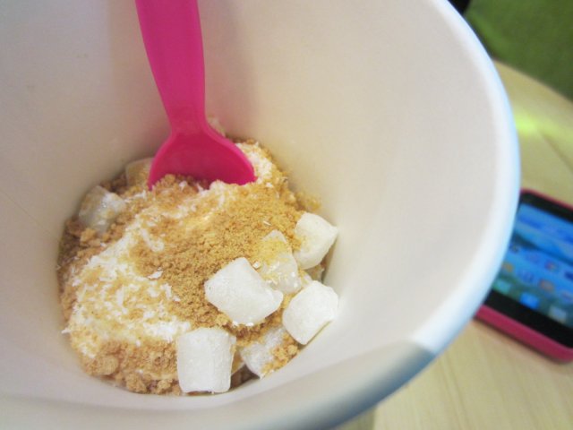 他们家的冰激凌还不错啦。 选择了原味的小杯。 店员推荐了糯米团,椰丝,和燕麦碎这3种配料。 冬天吃冰激凌, 真的是很爽的。