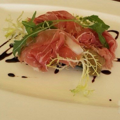 所有点的前菜里,考拉的这份是最有味道的!因为意式火腿会比较咸,中东茄打成了泥抹在了节瓜身上,最上面裹着意式火腿好美味,肉香蔬菜相结合得不错,火腿肉口感细腻新鲜!赞一个