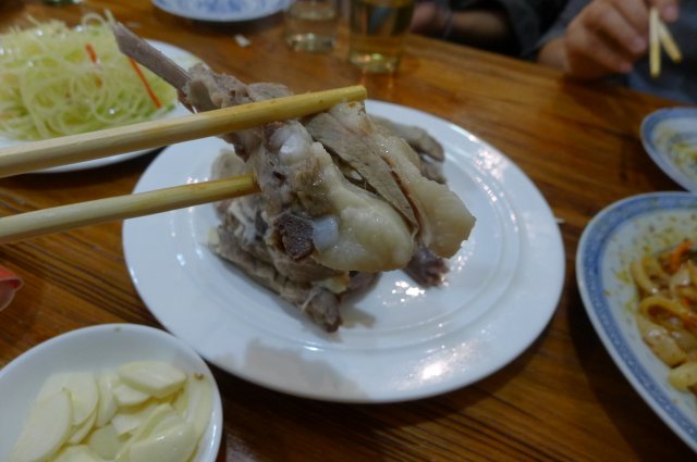 @手抓羯羊肉/98块一斤,一斤的羊肉果然不多啊,一人大概两块多羊肉就没有了,配的粉帮内蒙古吃到的一样,那种椒盐咸咸的味道还挺好吃的,因为那个羊肉本身没啥味道。羊肉的肉质很不错,而且非常嫩,比外地吃的嫩多了,果然还是喜欢吃这种样子的~活活,虽然羊肉不一定有外地的新鲜但反正我也吃不出来
