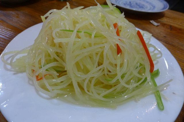 @酸辣土豆丝/12块,这种做法的土豆丝我觉得都很不错,酸酸辣辣的,很开胃,而且他们家土豆丝刀工切得很不错,非常细,而且皮什么的削的很干净。搭配着红绿色的辣椒丝看着很好看,这样才会吃的也舒服么~虽然这道菜很普通,但他们家做的让我很满意