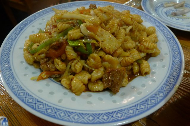 @炒面片(麻食)/10块猪肉,在西北的时候一直没有吃过这个么,可能我们吃饭地方没注意,反正在上海吃也是一样滴~他那个是感觉一个个搓出来的,样子长得很可爱,吃起来也很有嚼劲,而且味道很特别,不像一般的面食,主要是还加了点酸味。以后要是有机会再去西北可以去看看那里的麻食是什么样子滴~