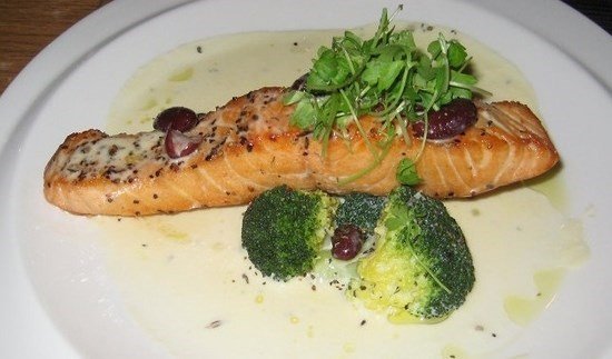 香煎三文鱼 配 西兰花 红腰果 & 马玉兰酱(50):沙拉开胃的然后呢,那就来主菜吧。火候掌控的很好,外焦里嫩,红配绿的配料,各自默默的为主角鱼肉提升着口感味道。
