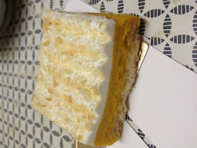 拿出来很结实的感觉 硬硬的。上面淡奶油不是很甜 配上中间的南瓜 丝滑的感受~~~ 下面是类似饼干类的物体。说不出是什么 好像是有杏仁的成分在里面。