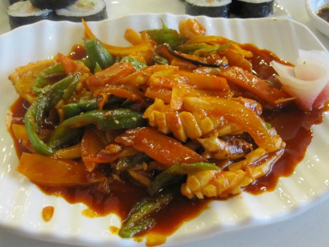 青椒炒鱿鱼 这道菜颜色很漂亮。鲜红的颜色。应该是用韩国辣酱炒的。青椒很脆。鱿鱼刀花切的很好看。口感香脆鲜。