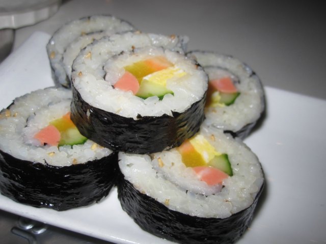 紫菜包饭 这个造型很漂亮。看着都不忍心吃了呢。里面有鸡蛋、香肠黄瓜 。味道香浓。米饭软糯,黄瓜爽脆。味道很好呢。