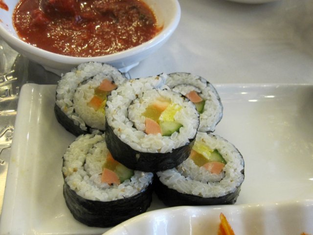因为是大中午的。而且天然也热。就没有吃烤肉。餐前小菜挺丰富了。上了5、6种,喜欢这种餐前的开胃菜。尤其喜欢那个土豆泥。软糯香甜。很好吃。我又跟服务员要了一碗吃呢。