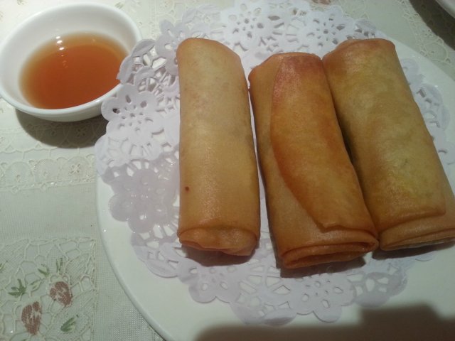 3个春卷,炸的金黄色,色泽均匀,外皮脆脆的,里面是素的呢,量也蛮多的,味道不错哟,我和BF一人一个,多出来的当然还是我吃啦,哈哈~