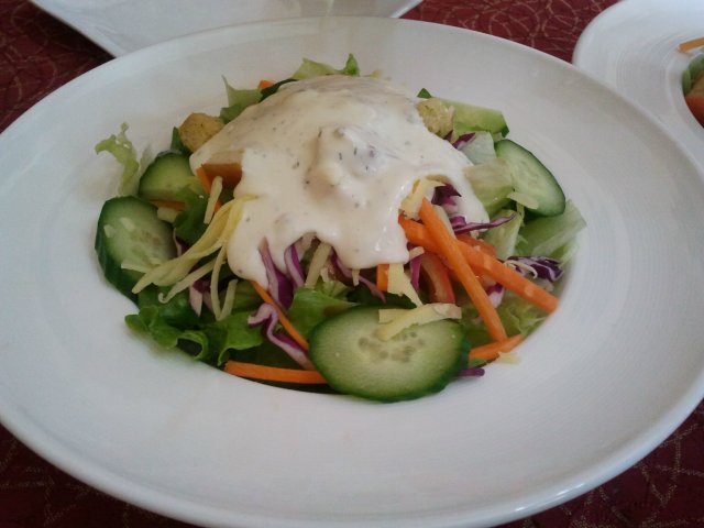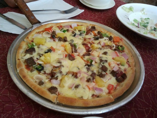 提拉米苏,不错,不过我也没吃出来比其他家的优势在哪儿,原谅我这张吃甜品都差不多的嘴。蔬菜沙拉,很喜欢凯撒酱,有点微咸的味道配沙拉最合适了。奶油蘑菇汤,灰常好喝,以前吃这些都觉得腻腻的,莫非现在当了孕妇改口味啦,反正我一个人喝了一碗左右。至尊披萨,饼烤的很脆很好吃,就是太多了根本吃不了,我基本上吃了一牙就饱了。意大利肉酱面,坑爹,比那个意大利面+酱贵了6块钱,上来依然没看出来肉在哪儿,就是烂肉渣渣让我们看一眼也好嘛,味道只有蕃茄酱的味道,太单一了,我不喜欢,不过配的那个面包还是很好吃的。