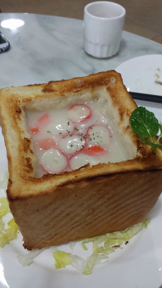 越来越多的菜式用面包当作容器,有装咖喱鸡/牛肉,装海鲜汤的并不多~他们家的海鲜汤更像是羹,奶油汤汁很绸,面包烤得焦脆~最上层盖满了蟹肉棒,汤里内容丰富,但是小伙伴们说味道不怎么样...