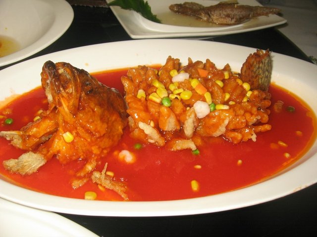 松鼠鲑鱼,大油锅炸的,酸甜的酱汁浸润到鱼肉里面,味道不错哦。