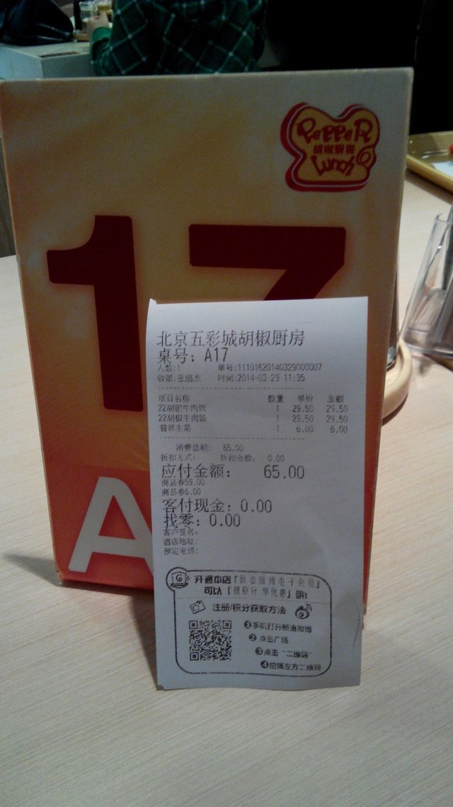 胡椒厨房在海淀区清河中街68号华润五彩城L563号,带孩子来玩,正好有招行9积分+9元兑换的胡椒牛肉饭,就来此吃了。店内面积不大,有7、8桌的样子,服务员态度较好,兑完验证码后,等了有五六分钟之后饭上来了,忘了说少要胡椒了,结果给撒的还真多,挑都挑不出来,铁板端上桌后,要迅速搅拌,把未熟的牛肉赶紧加热弄熟,铁板边上还给围了一圈纸挡着油别溅出来,但还是有些许溅在了手上。桌上备有各种调料汁,喜欢那种甜口的,倒了不少,饭里唯一的蔬菜就是玉米粒了,营养方面有点不太均衡。好在还兑换了一份生菜,量不大,但是味道还是不错的。