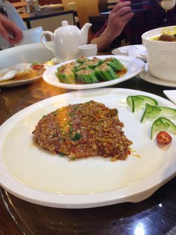 那天吃的最贵的是火焰银鳕鱼,168,端上来以后倒了杯油在鱼块的四周,然后点把火,烧了有20几秒,够大家拍照。鱼肉本身很鲜嫩,顶上扣了蒜泥味道偏咸 有些盖过鱼肉本身的味道,但是整体还是不错的。