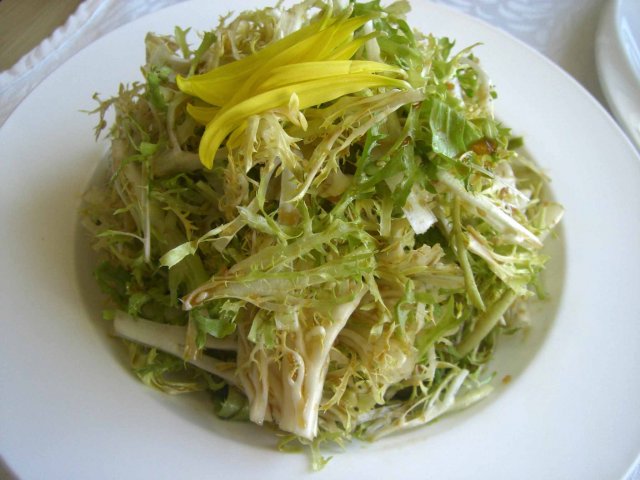 一小盆那种,量很大,苦菊新鲜,料汁微甜,还有***花点缀,这价格也太实惠了吧