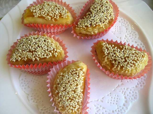 是我喜欢的酥皮版,趁热吃香香的,馅料给得好足,从侧面都要爆出来了!最后结帐还把零头给抹了,店家还真是大方~