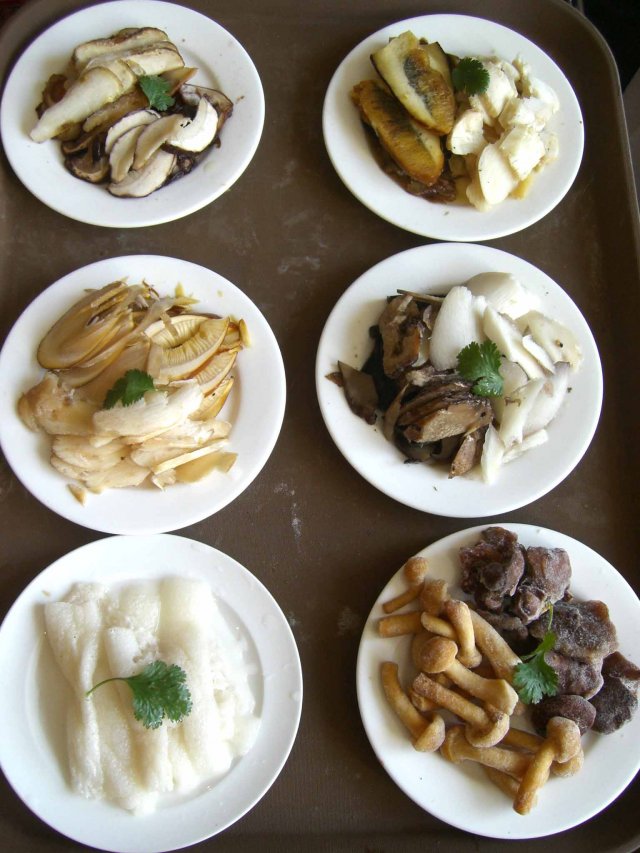 蘑菇宴分两大种,一种叫“精品山珍宝”,包括12种蘑菇,便宜些;另一种叫“极品山珍宝”,包括11种野生蘑菇,要贵些。