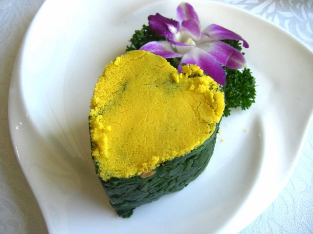 造型很有爱,塑成心形,表层是咸蛋黄沫沫,心中镶嵌着花生米,美味又赏心悦目!