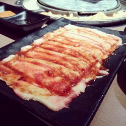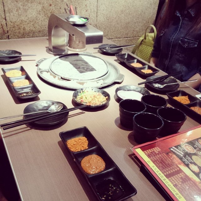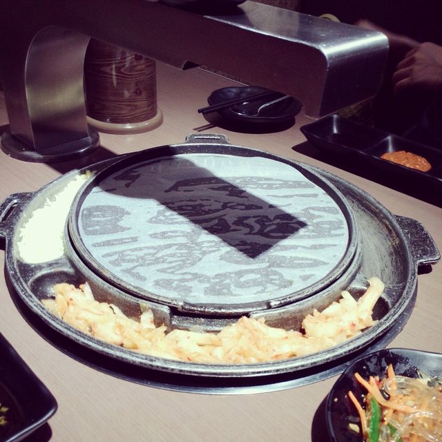 烤肉锅边边也已经放了芝士跟泡菜 烤肉的时候基本上油都会往下漏 所以芝士跟泡菜上面都是油