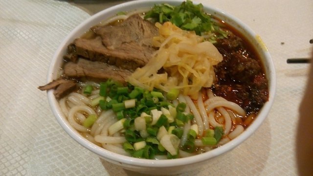 最后要了碗牛肉粉,在北方一直没有找到比较对口味的粉,这次想尝试一下,一大碗的粉上面有大片的牛肉和牛肉块,还有白菜,白菜吃起来很酸爽,牛肉很烂,尤其是牛肉粒,不塞牙,粉给的挺多的,汤汁味道感觉不好,可能大饭店做这些面食比较少,跟外面小门脸里卖的牛肉粉味道还是差挺远的。
